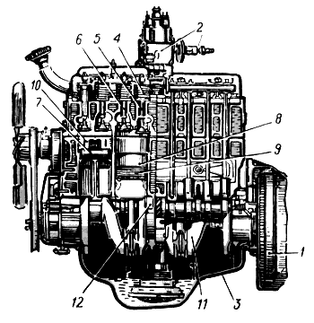 Рис. 1. Применение металлов в тракторном двигателе: 1 — углеродистая сталь с повышенным содержанием марганца (зубчатый венец маховика); 2 — серый чугун, сталь, бронза, алюминий, пружинная сталь (детали топливного насоса); 3 — серый чугун (поддон); 4 — пружинная сталь (пружина клапана); 5 — хромоникелевая сталь (впускной клапан); 6 — клапанная жаропрочная сталь (выпускной клапан); 7 — углеродистая сталь (поршневой палец); 8 — легированный чугун (гильза блока цилиндров); 9 — износоустойчивый чугун (поршневое кольцо); 10 — алюминиевый сплав (поршень); 11 — углеродистая сталь с повышенным содержанием марганца (коленчатый вал); 12 — высокооловянный баббит (вкладыш). |