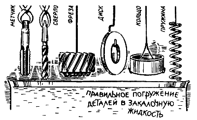 Детали опускают в охлаждающую среду определенным образом (рис. 43): сверла, развертки и другие длинные детали — режущей частью вперед, то есть вертикально; плоские детали — перпендикулярно поверхности жидкости. Если закалке подлежит только часть инструмента (например, режущая часть сверла), то деталь опускают в охлаждающую жидкость на нужную глубину и слегка перемещают ее вверх-вниз в жидкости, «размывая» границу закалки. Рис. 43. Правильное погружение деталей в закалочную жидкость |