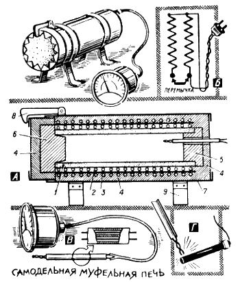 Муфельную печь небольших размеров можно изготовить и в домашних условиях (рис. 44,А).