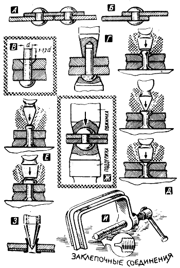 Если же нужно сохранить форму полукруглой головки, применяем вспомогательный инструмент: помещаем закладную головку на специальную поддержку, зажатую в тисках (рис. 26, Ж). После обжимки листов замыкающую головку слегка формуем молотком, а завершаем формовку непосредственно обжимкой (рис. 26, Ж).